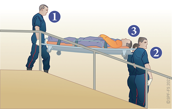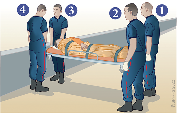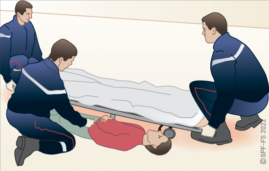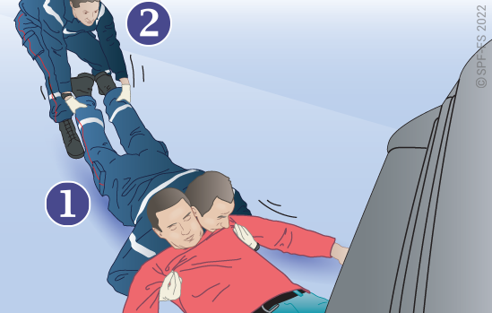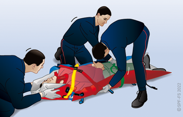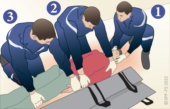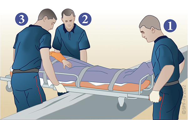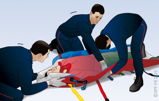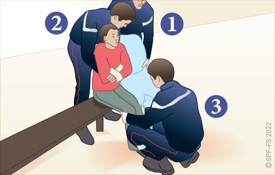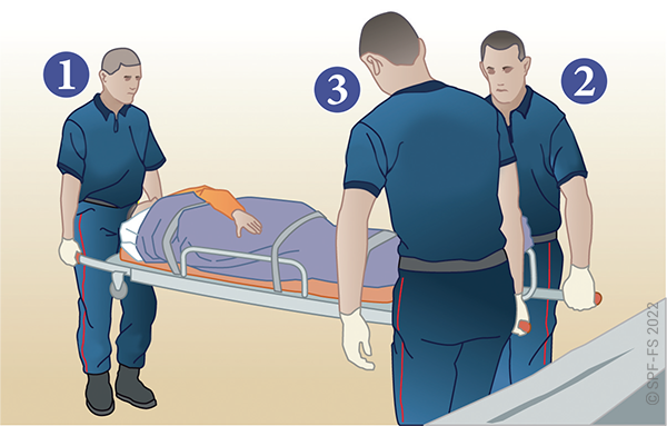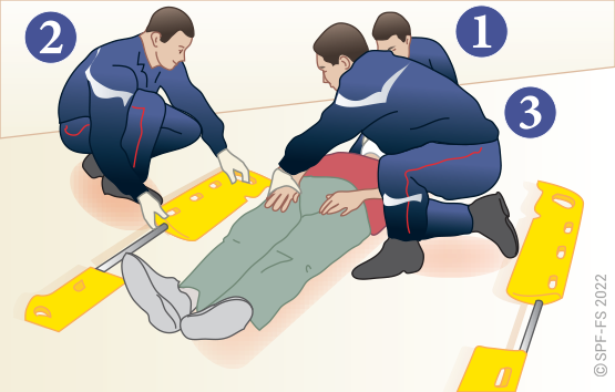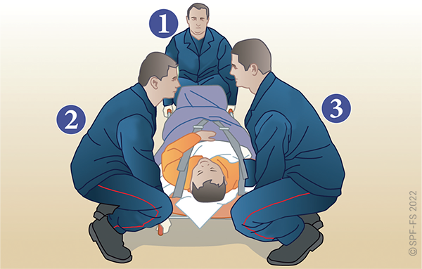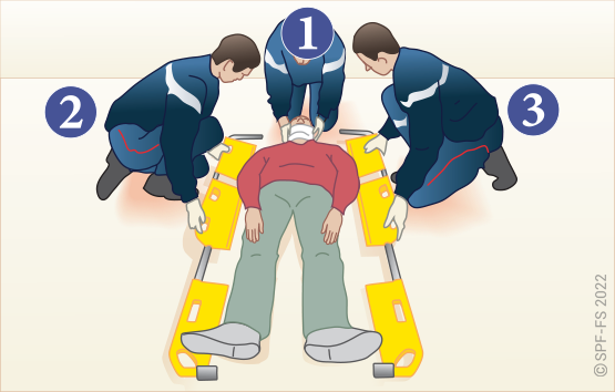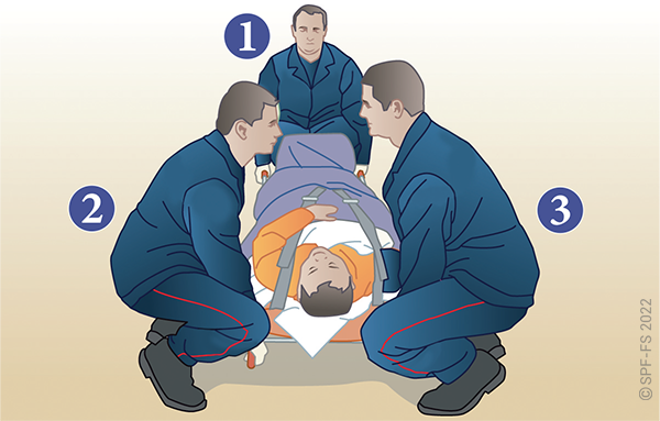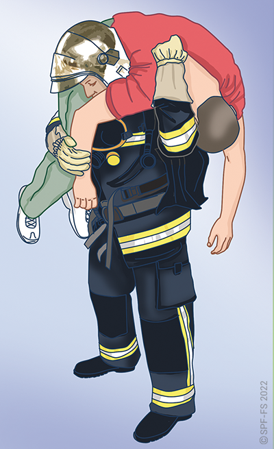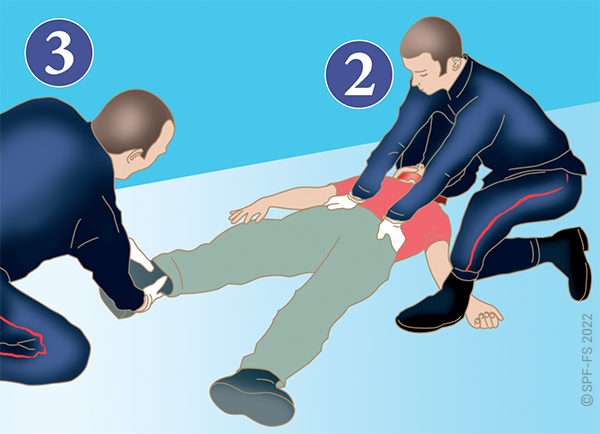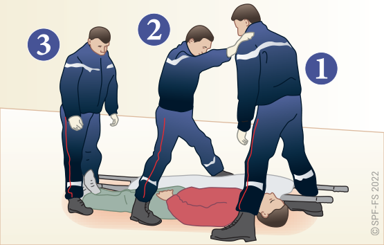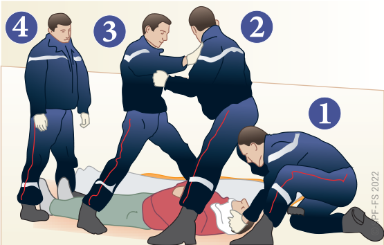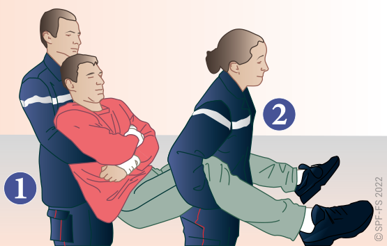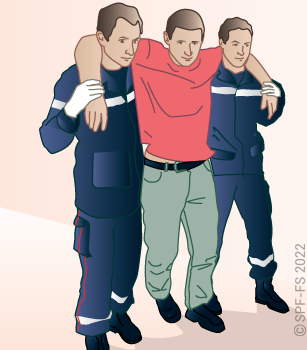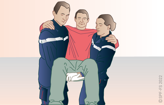 Le sapeur-pompier « épaule » est avantageusement remplacé par deux sapeurs-pompiers positionnés de part et d'autre de la victime.