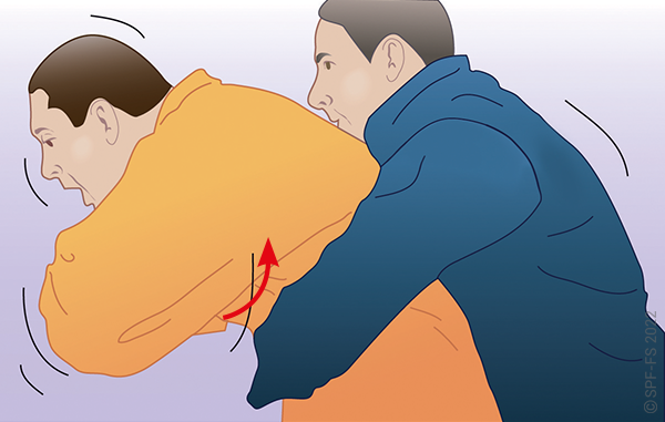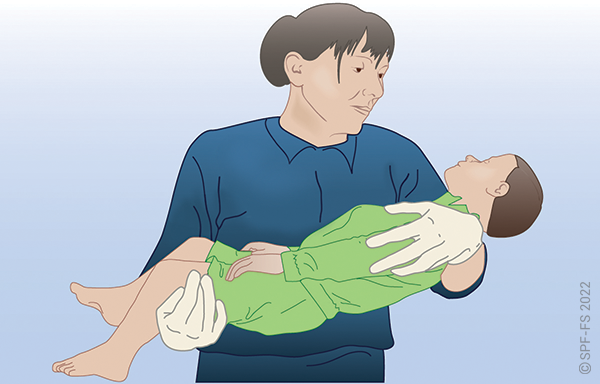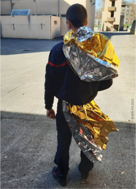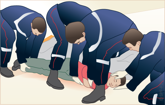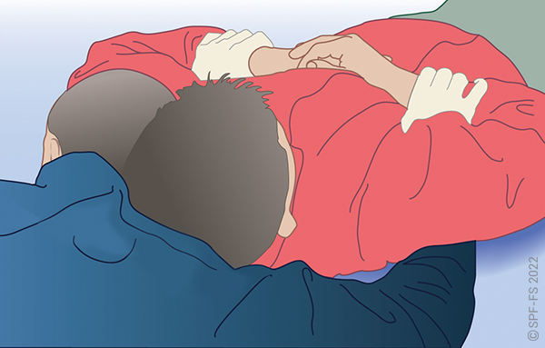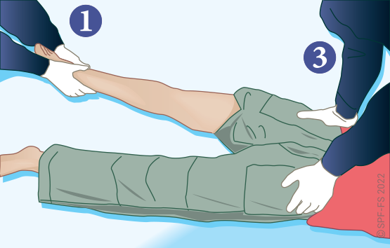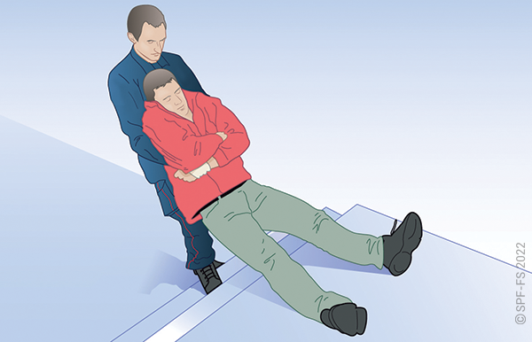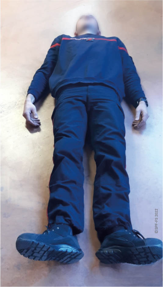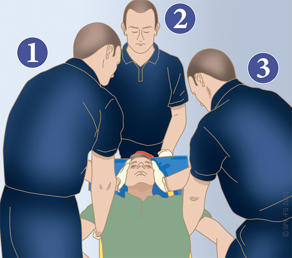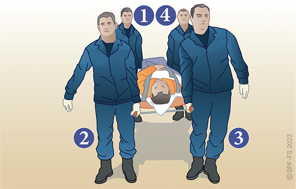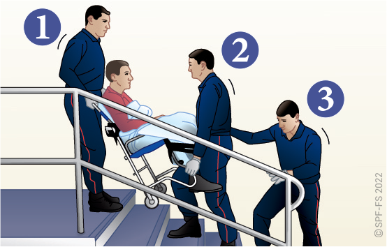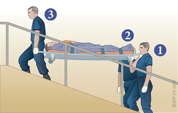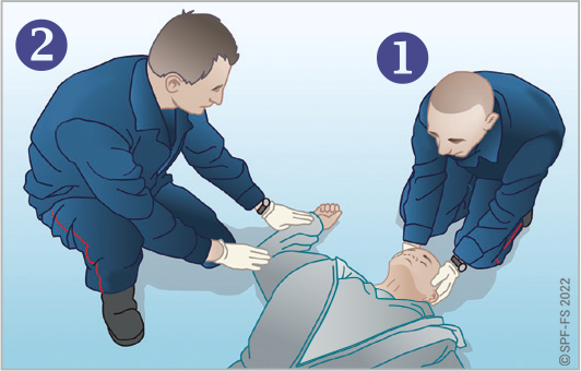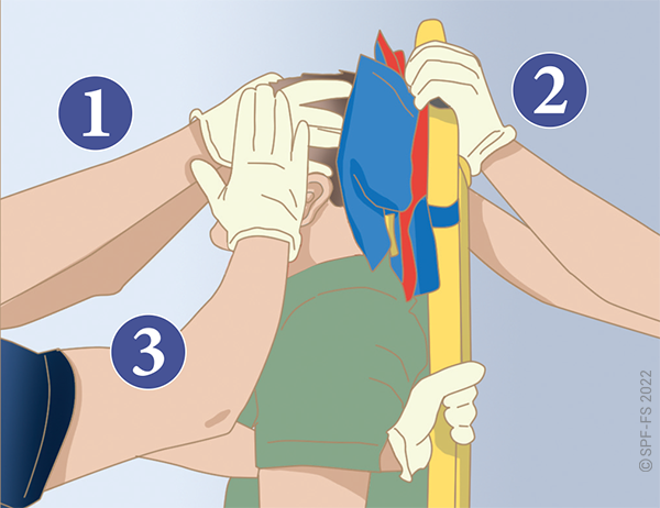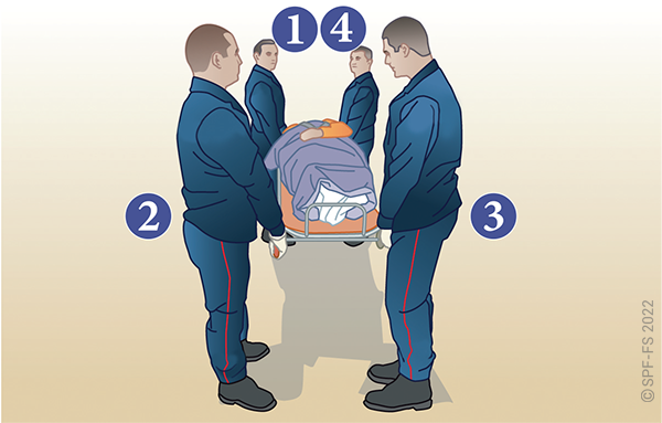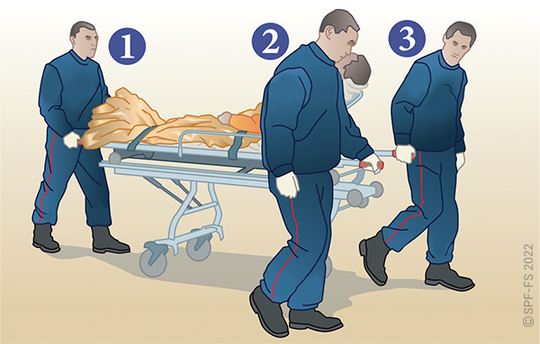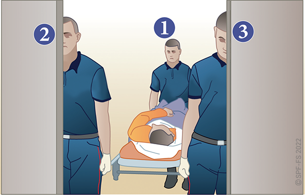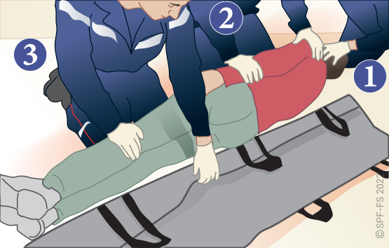 Le sapeur-pompier « épaule » est avantageusement remplacé par deux sapeurs-pompiers positionnés de part et d'autre de la victime.