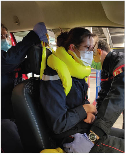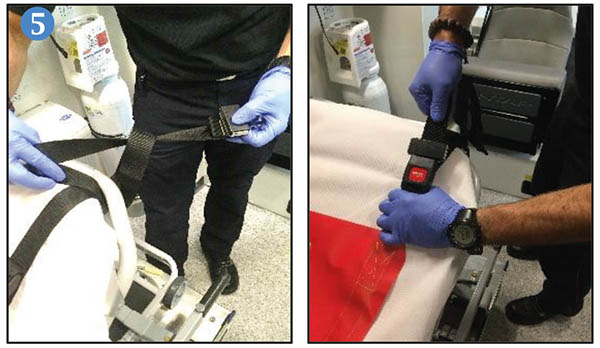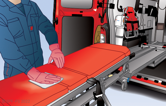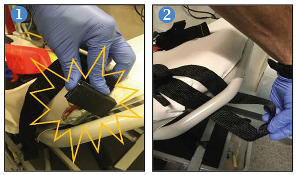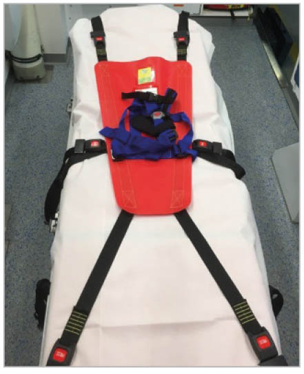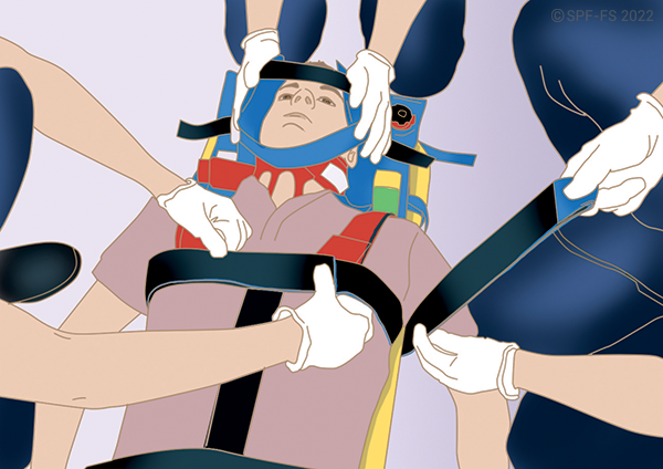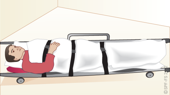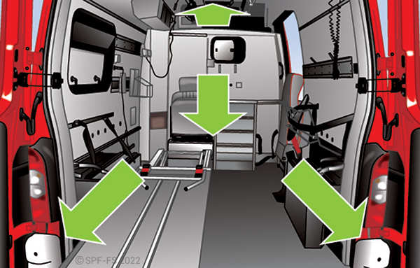Toute victime transportée en VSAV doit obligatoirement être ceinturée. L'évacuation sur brancard ne déroge pas à cette règle et impose un conditionnement spécifique pour se conformer aux conditions de transport imposées par le code de la route.