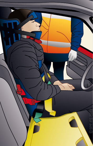 Cette technique permet l'extraction en sécurité d'une victime assise, dont les mouvements du rachis ont été préalablement restreints au moyen d'une attelle cervico-thoracique (ACT) (cf. fiche technique I.02) hors d'un véhicule léger peu déformé lorsque le dégagement par la porte située de son côté n'est pas réalisable ou lorsqu'elle présente une atteinte traumatique de la jambe.