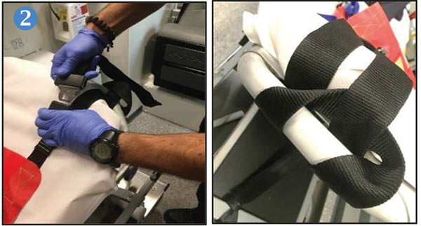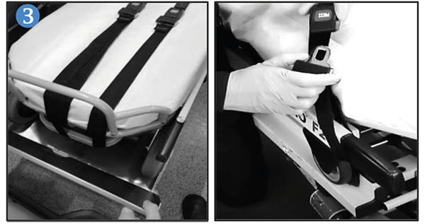 Centrer le harnais en amarrant les sangles latérales au châssis du brancard ; puis les serrer.