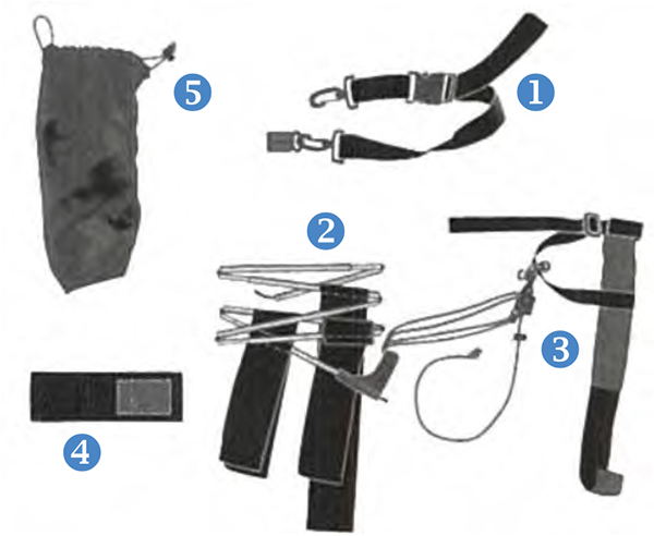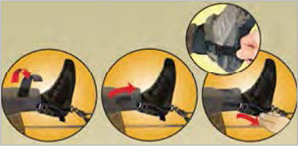 Fixer et ajuster les sangles en partie basse (2 possibilités : châssis ou poignées du brancard) ; puis les serrer pour mettre en tension le harnais.