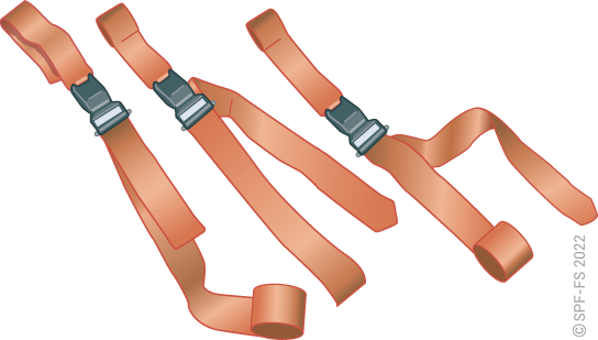 Fixer et ajuster les sangles en partie haute en les passant en tête de brancard à l'aide d'un demi-cabestan. Noeud : cf. annexe en point 6.