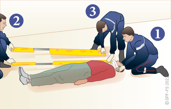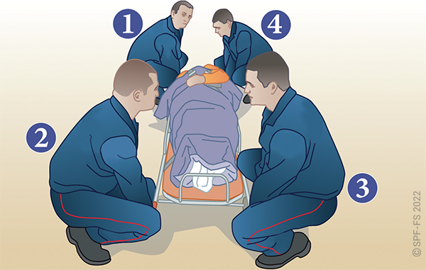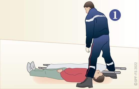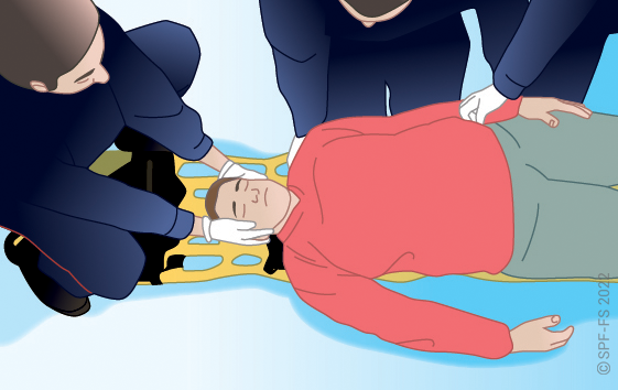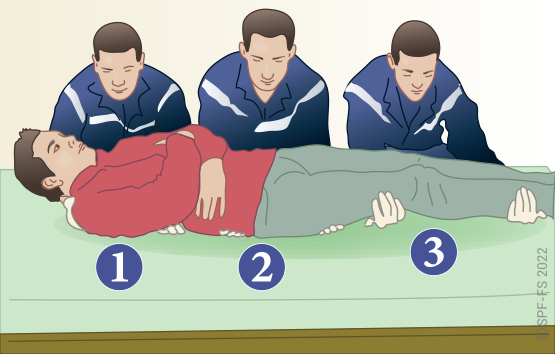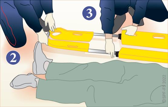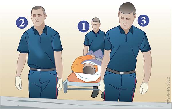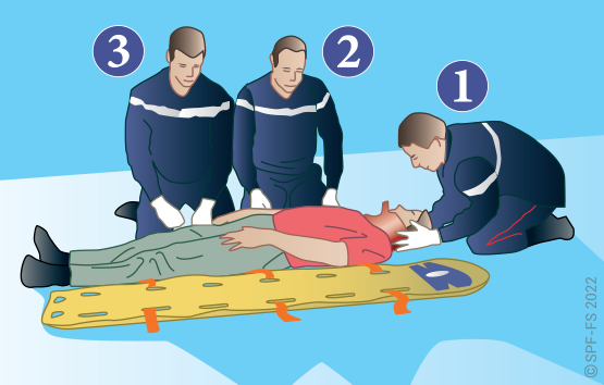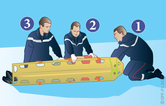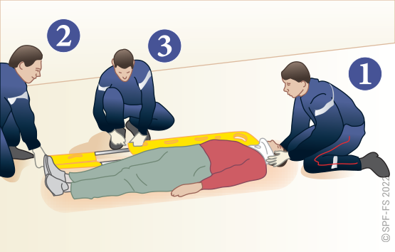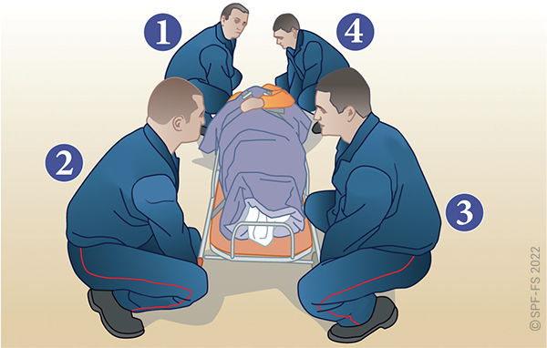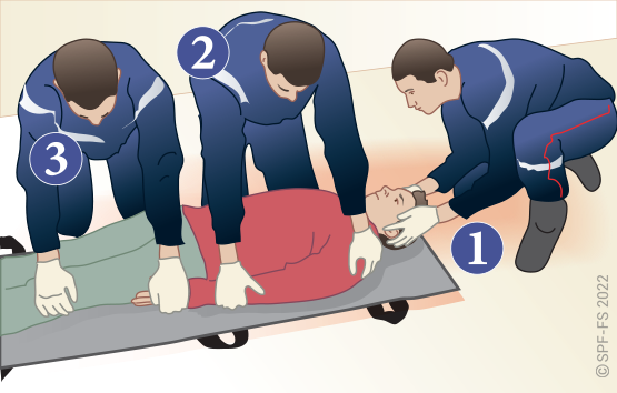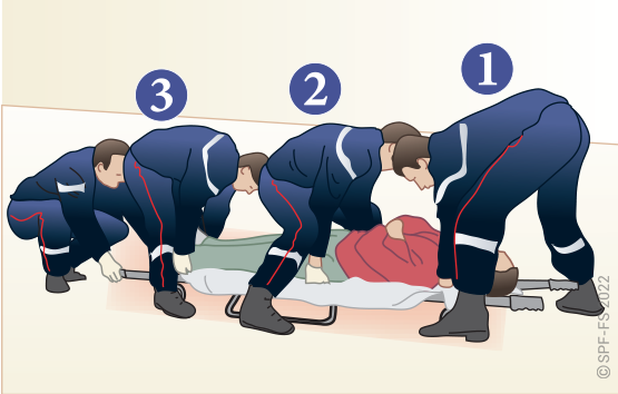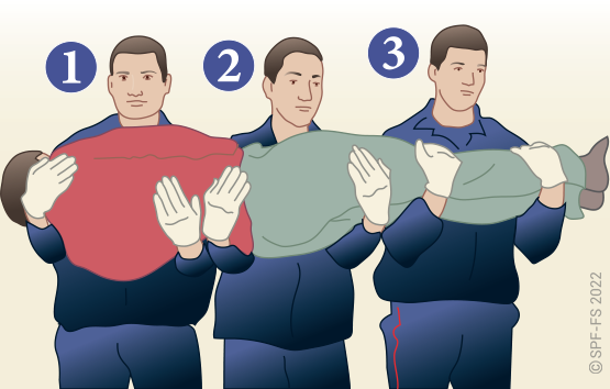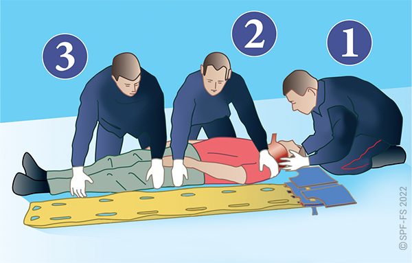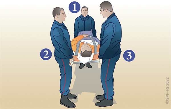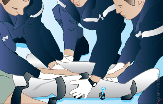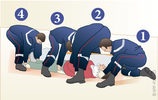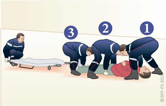 Le sapeur-pompier « épaule » est avantageusement remplacé par deux sapeurs-pompiers positionnés de part et d'autre de la victime.