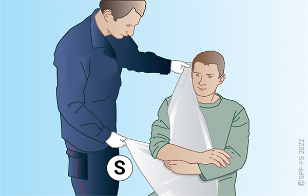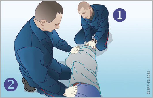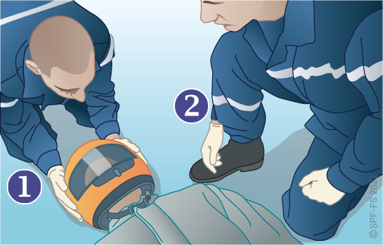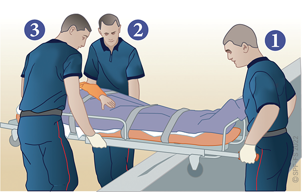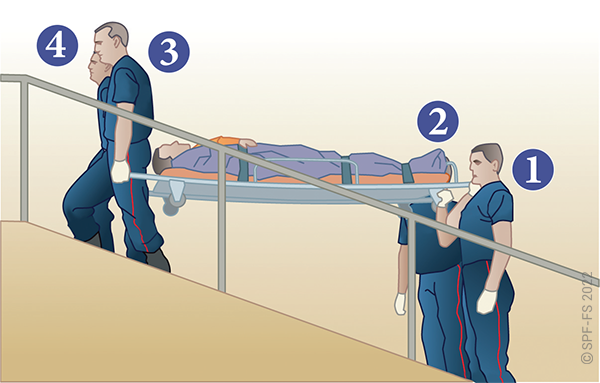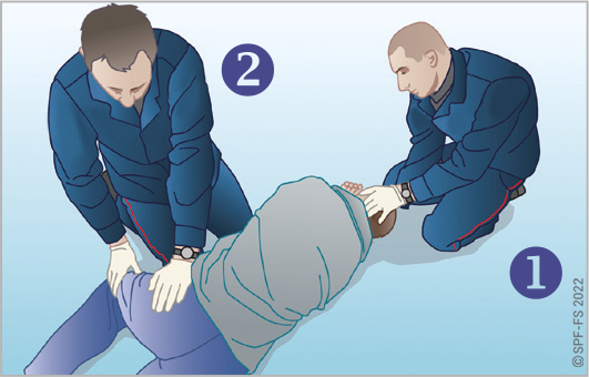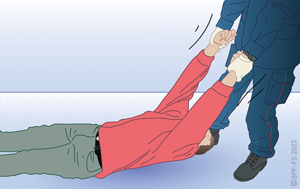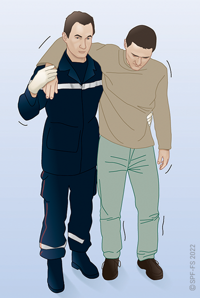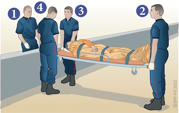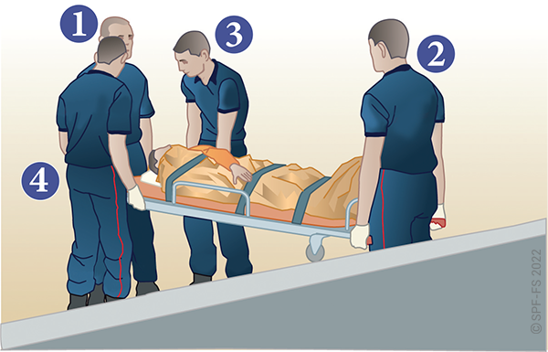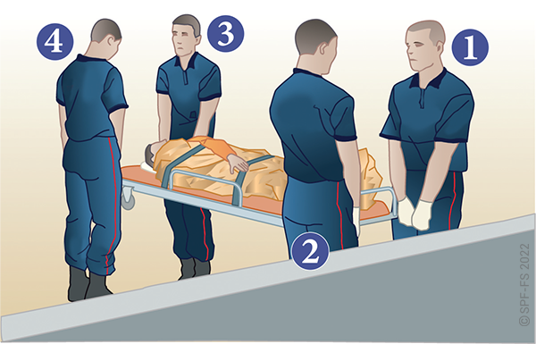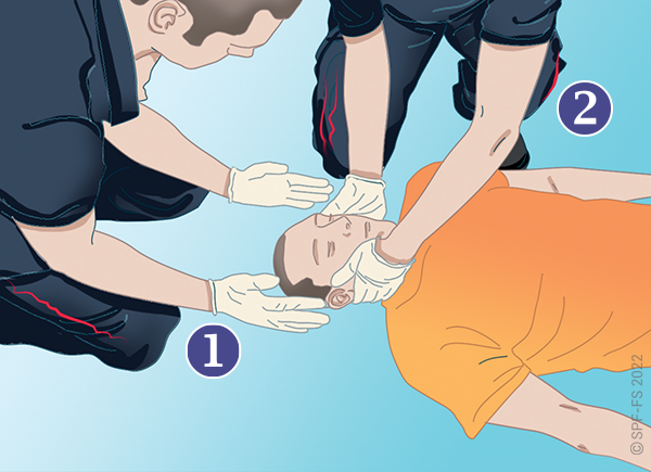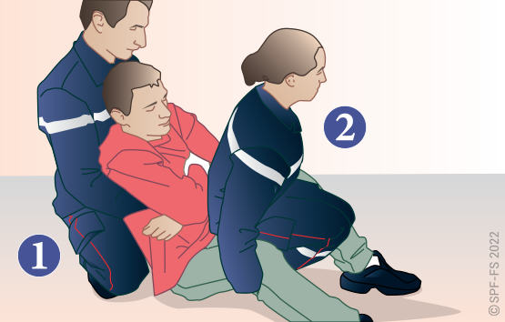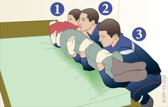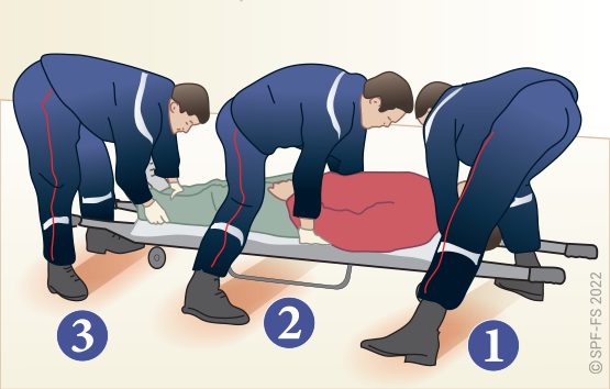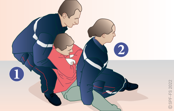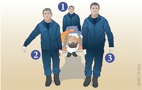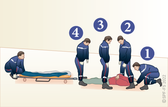 Le sapeur-pompier « épaule » est avantageusement remplacé par deux sapeurs-pompiers positionnés de part et d'autre de la victime.