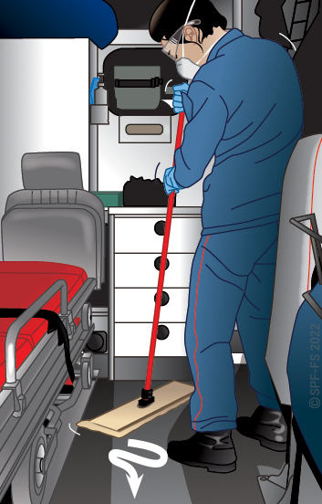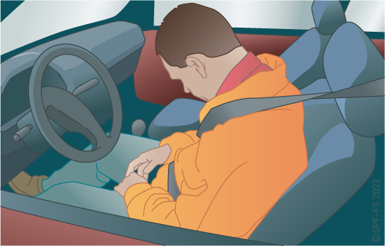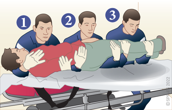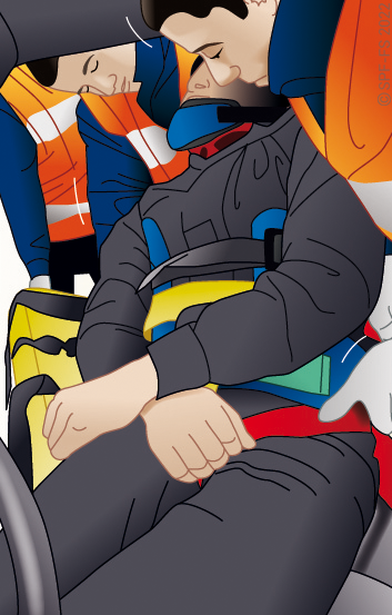 Toute victime transportée en VSAV doit obligatoirement être ceinturée. L'évacuation sur brancard ne déroge pas à cette règle et impose un conditionnement spécifique pour se conformer aux conditions de transport imposées par le code de la route.