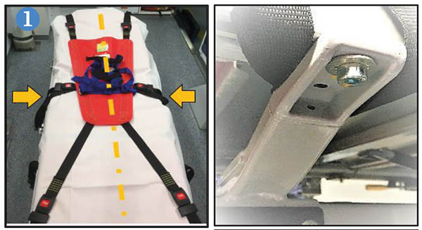 Centrer le harnais en amarrant les sangles latérales au châssis du brancard ; puis les serrer.